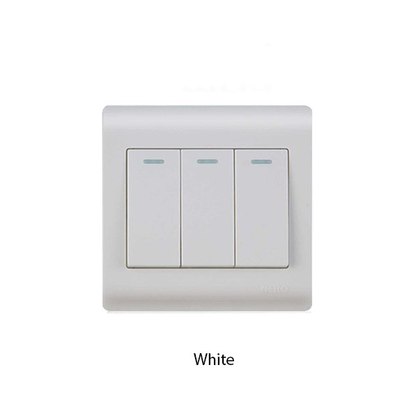 Saklar Nero Casa F16 3-gang 2-way cocok digunakan pada tangga panjang, ballroom, hotel suite.