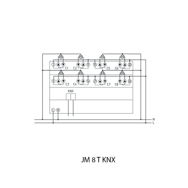 JM 8 T KNX merupakan base module untuk memperluas konfigurasi, dirancang untuk mengendalikan blinds/roll-shutters, tirai, jendela atap. Jumlah kanal konfigurasi 8 kanal, dilenkgapi LED Status untuk setiap kanal, tombol manual local operation KNX. Menggunakan potential-free contacts untuk setiap kanal, yang memungkinkan integrasi dalam sistem dengan SELV (Safety Extra Low Voltage) bila seluruh unit dikonfigurasi.