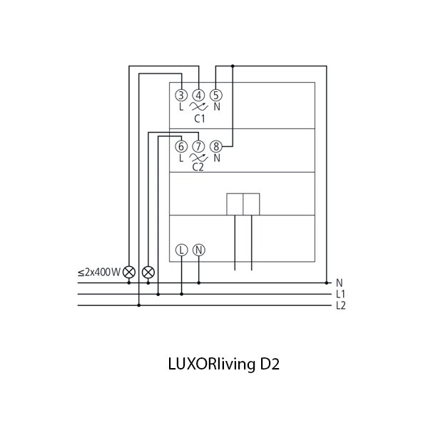 LUXORliving D2 merupakan aktuator dimmer 2 kanal dalam system smart-home LUXORliving untuk mengatur intensitas lampu (LED, Incandescent, halogen). Dilengkapi LED pada setiap kanal sebagai penanda visual nyala/dimming. Setiap kanal memiliki kemampuan dimming 0-100% dengan beban 400W per-kanal. Penyesuai intensitas lampu dapat juga melalui unit dimmer, konfigurasi menggunakan software LUXORplug dan pemrograman menggunakan ETS (Engineering Tool Software). Dirancang untuk pemasangan pada panel distribusi listrik (DIN-Rail)