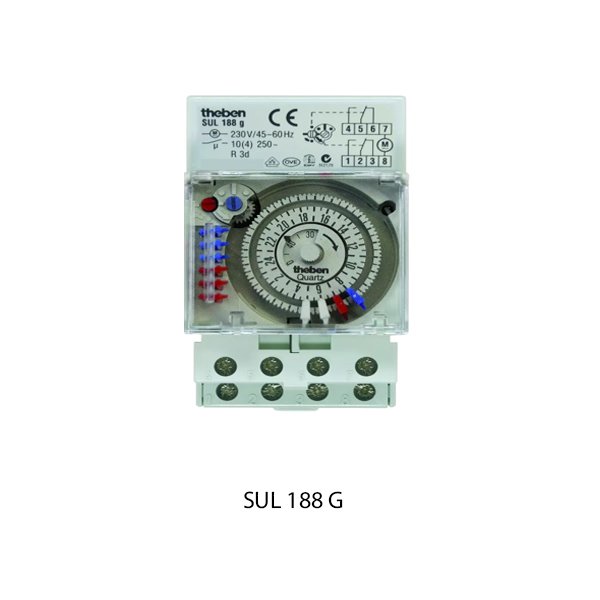 Theben SUL 188 G merupakan timer analog bentuk saklar 2 kanal dengan skema program harian untuk mengatur on/off perangkat setiap hari menurut jadwal. Menggunakan mekanisme quartz‑controlled stepper membuat penunjukan waktu lebih stabil dan akurat dibanding timer mekanik konvensional, dilengkapi cadangan battery (power reserve/battery backup NiMH) untuk mengantisipasi agar timer tidak reset saat listrik padam (maks 3 hari). Output berupa kontak “changeover / potential-free / phase-independent” untuk memberi fleksibilitas mengendalikan berbagai jenis beban listrik. Dilengkapi 10 “tappets / cavalier” (segmen pada dial timer) bawaan untuk pengaturan ON/OFF yang memungkinkan fleksibilitas dalam pengaturan waktu. Menggunakan diameter kabel 0,5–2,5 mm² dan terminal pegas DuoFix.