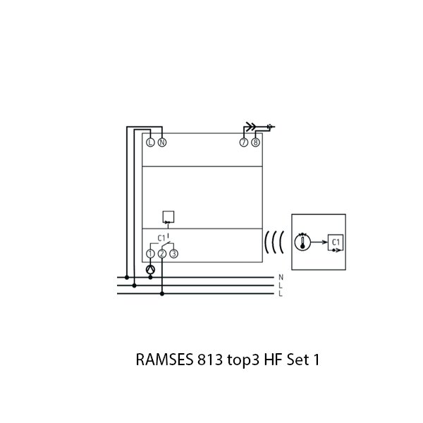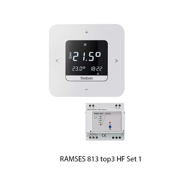 Theben RAMSES 813 top3 HF Set 1 merupakan sistem pengendalian suhu ruangan berbasis radio (nirkabel), dilengkapi receiver sebagai penerima signal dan penggerak (relay). Memiliki tampilan digital, mendukung programming suhu untuk dikonfigurasi individu (misal: siang hari, malam hari, akhir pekan) berdasarkan waktu dengan fleksibel. Mekanisme kontrol dikendalikan pada perangkat atau aplikasi melalui Bluetooth Low Energy (BLE) tanpa perlu koneksi internet atau cloud. Dilengkapi Battery 2 x AA untuk fleksibilitas instalasi (retrofit/Instalasi baru).