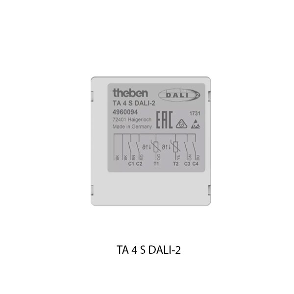 TA 4 S DALI-2 merupakan gateway antara tombol/sensor yang dipasang di dinding dengan sistem kontrol pencahayaan berbasis DALI-2. Memiliki empat input penghubung potential-free dan push button yang dapat diatur jenis kontaknya melalui memory bank. Memiliki dua input tambahan untuk resistansi variable (slider, potentiometer). Power dipasok oleh bus DALI yang dipasang pada flush-mount.