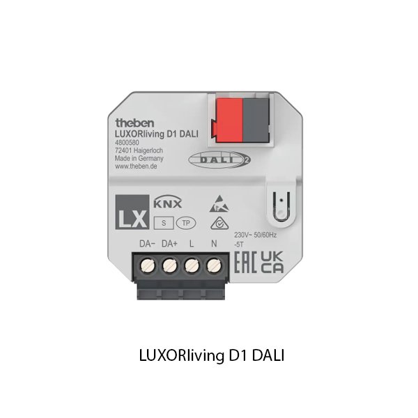 LUXORliving D1 DALI merupakan aktuator DALI (Digital Addressable Lighting Interface) dalam system smart-home LUXORliving sebagai interface antara bus KNX dengan system DALI. Mendukung hingga 30 ballast / peralatan DALI dalam mode broadcast per-kanal, dapat mengendalikan berbagai jenis lampu DALI (konvensional, RGB, RGBWW, Tuneable White DT-8). Memiliki 2 Input Binary untuk menyambungkan tombol tekan, sakelar, sensor jendela, sensor suhu. Mampu monitoring temperature internal untuk mencegah overheat / beban terlalu berat.