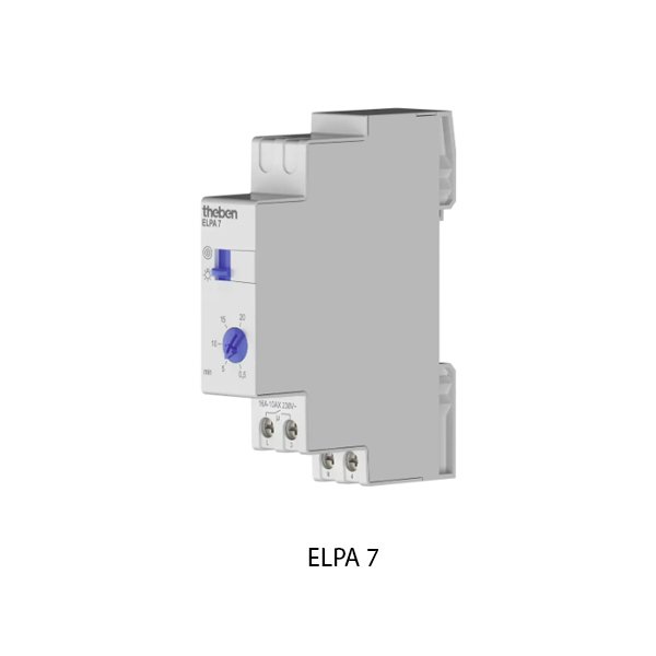 Theben ELPA 7 merupakan timer digital untuk penerangan area tangga dengan timer otomatis. Mendukung toggle switch untuk mode lampu permanen/continuous (lampu tetap menyala saat timer off). Dilengkapi “switch-off pre-warning” sebagai indicator saat limit timer hampir habis (lampu berkedip dua kali). Mendukung  zero-cross switching untuk melindungi kontak relay dan memperpanjang umur lampu/ beban yang dikendalikan