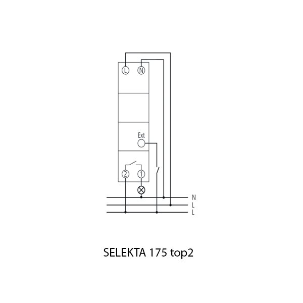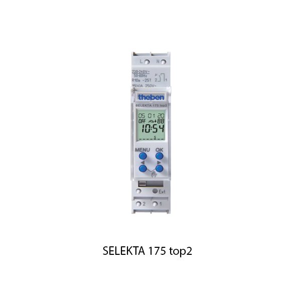 Theben Selekta 175 merupakan timer digital satu kanal untuk mengendalikan sirkuit/beban listrik secara otomatis berdasarkan program mingguan, memiliki kemampuan otomatis menghitung dan menggunakan waktu matahari terbit dan terbenam (astro-program) untuk switching.