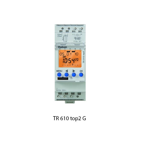 Theben TR 610 top2 G adalah timer digital 1‑kanal untuk mengatur otomatis on/off sirkuit listrik berdasarkan jadwal mingguan, menggunakan relai kontak emas dan ideal untuk beban ringan atau kontrol perangkat kecil.ocok untuk lampu, pompa kecil, sistem ventilasi, peralatan kontrol, atau rangkaian elektronik.
