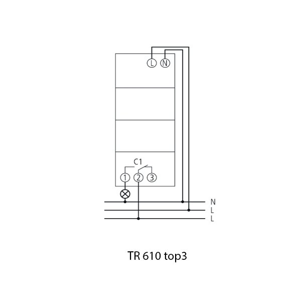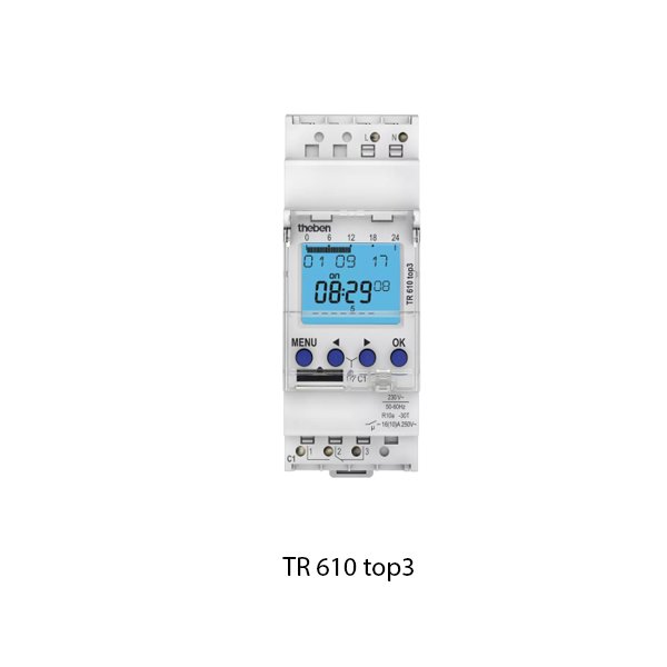 Theben TR610 merupakan timer digital untuk mengatur otomatis on/off sirkuit listrik berdasarkan jadwal mingguan, dilengkapi module BLE (Bluetooth Low Energy) untuk memudahkan pemrograman jadwal melalui aplikasi tanpa harus manual diperangkat. Interface menampilkan waktu dan tanggal pra-set, panduan berbasis teks, mudah dikonfigurasi tanpa daya utama. Memiliki 1 kanal output untuk beban kontrol Tunggal.